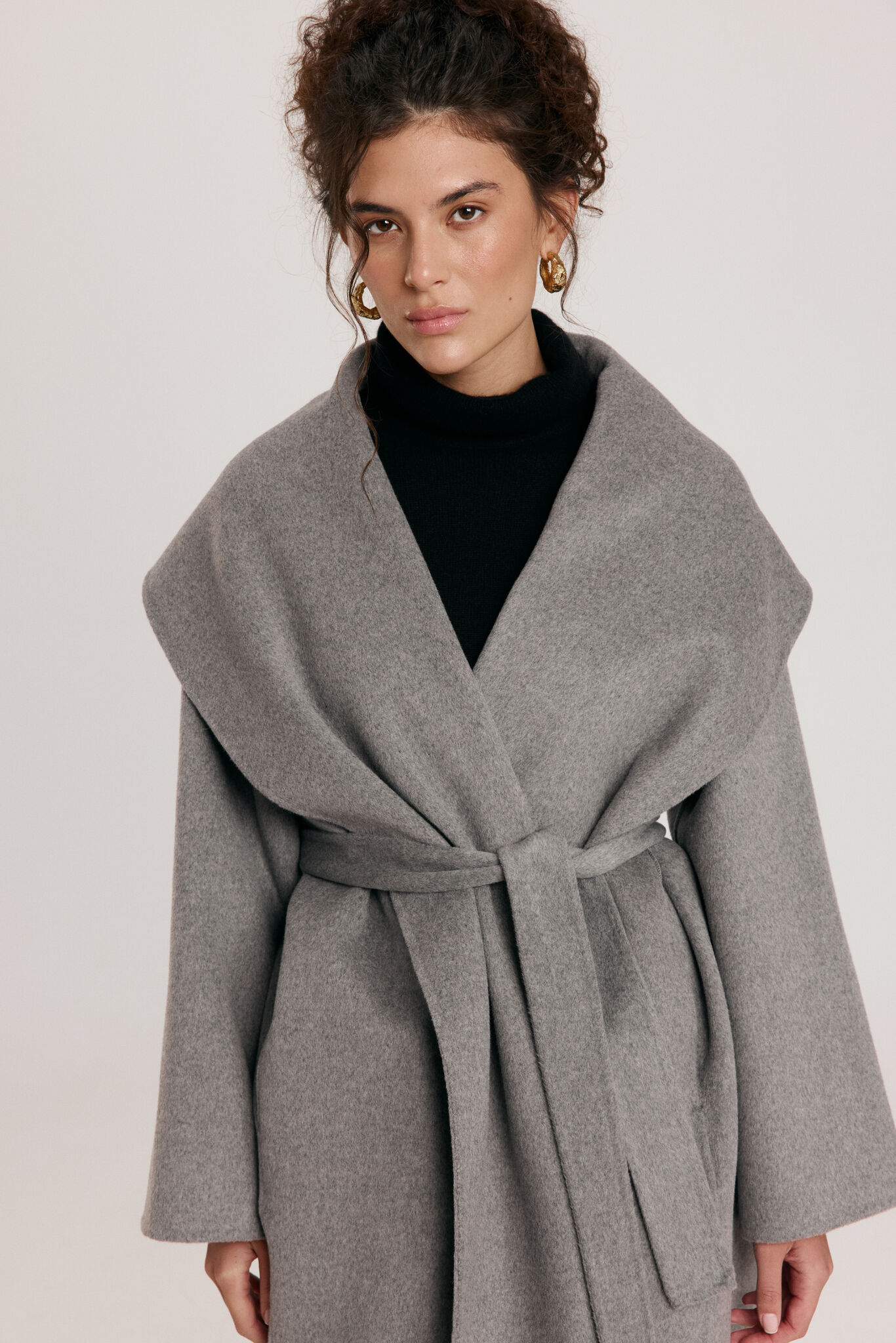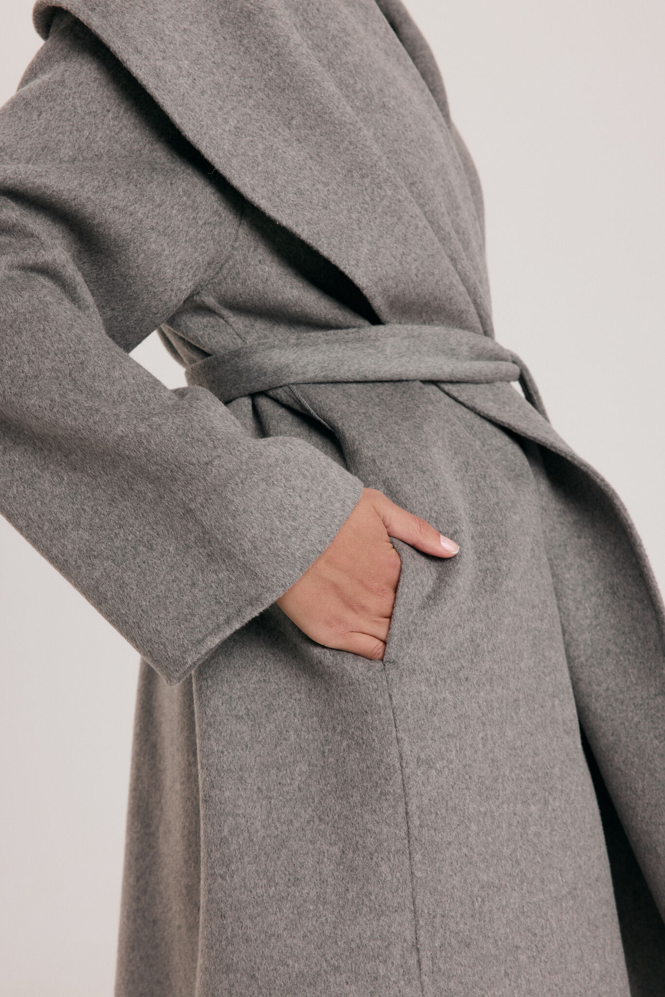Пальто на запах с поясом, выполнено из шерсти и кашемира.